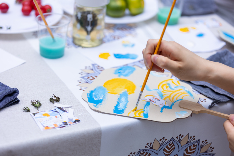 中国自古以来便有托物言志,借物抒情的巧思厚意,象征着团圆友善、吉祥如意的团扇工艺受到了师生们的喜爱。在非遗传承老师的指导下,大家亲手绘制团扇,用黄、白、蓝三色,描绘出一幅幅秋意满满的中秋团圆图景。来自中国澳门的胡丽姿同学表示,由于疫情,这个中秋节她无法和家人团聚,她会将自己亲手制作的团扇送给家人,将带有美好寓意的祝福传递下去。