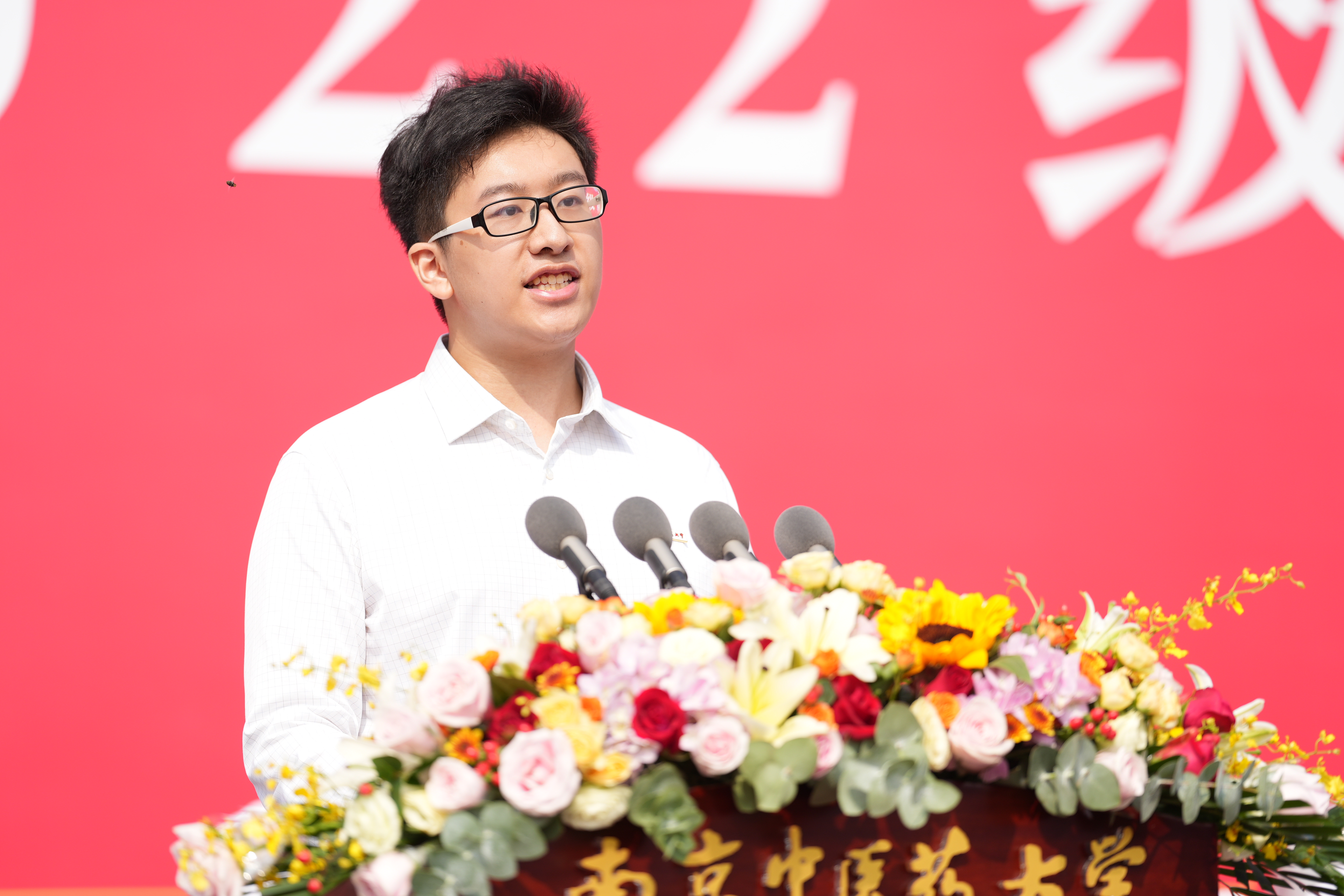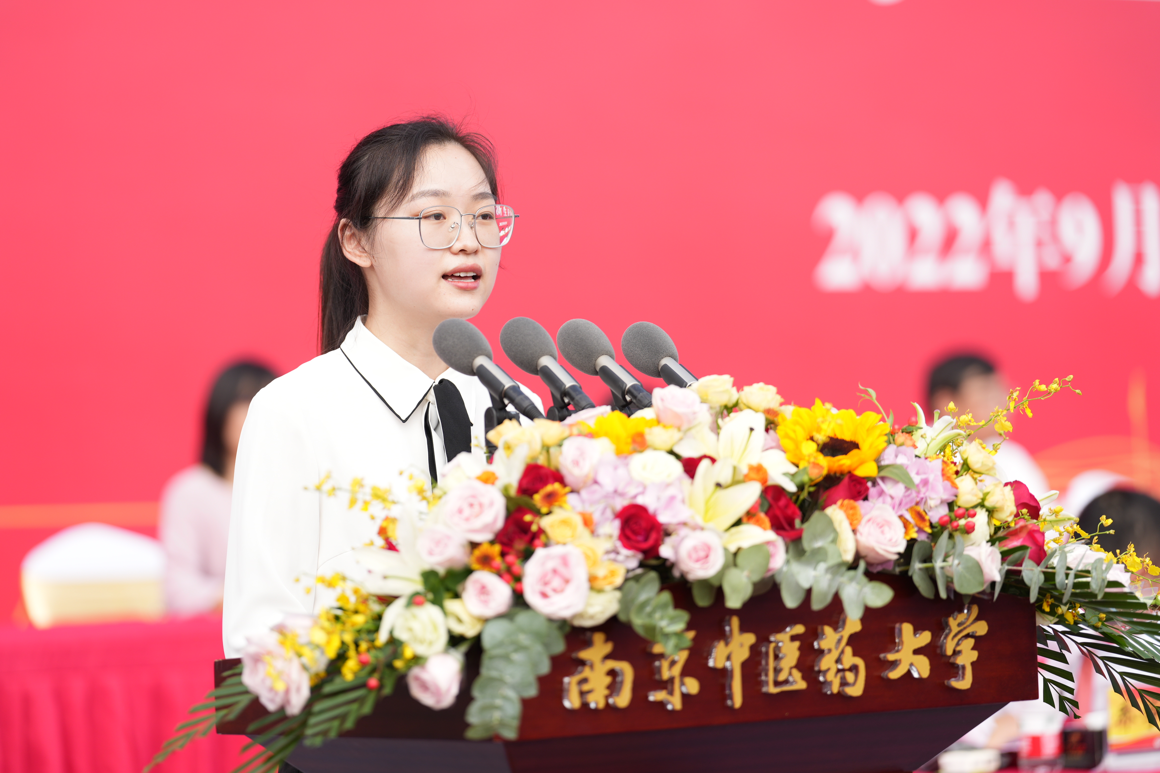本科生新生代表、中药学九年制专业武城弘,研究生代表、中医学九年制专业博士研究生卜岍岍先后发言。武城弘回顾了高中三年披荆斩棘、奔赴中医药理想的追梦之路,表达了对大学生活的期待。他表示,作为南中医新一代的学子,更应秉承博采众长、兼收并蓄、守正创新、继往开来的精神,做与时代接轨的中医药人,做走向世界的中医药人。卜岍岍在发言中深情回顾了在校期间的成长历程,同时她还分享了对“医学生”肩负的使命与担当的理解。“面对中医药发展的历史性机遇,我们南中医学子要以‘乘风破浪会有时’的耐心,‘扶摇直上九万里’的信心,‘任尔东西南北风’的恒心,‘不破楼兰终不还’的决心,深入挖掘中医药宝库,实现新时代中医药传承、创新与发展。”