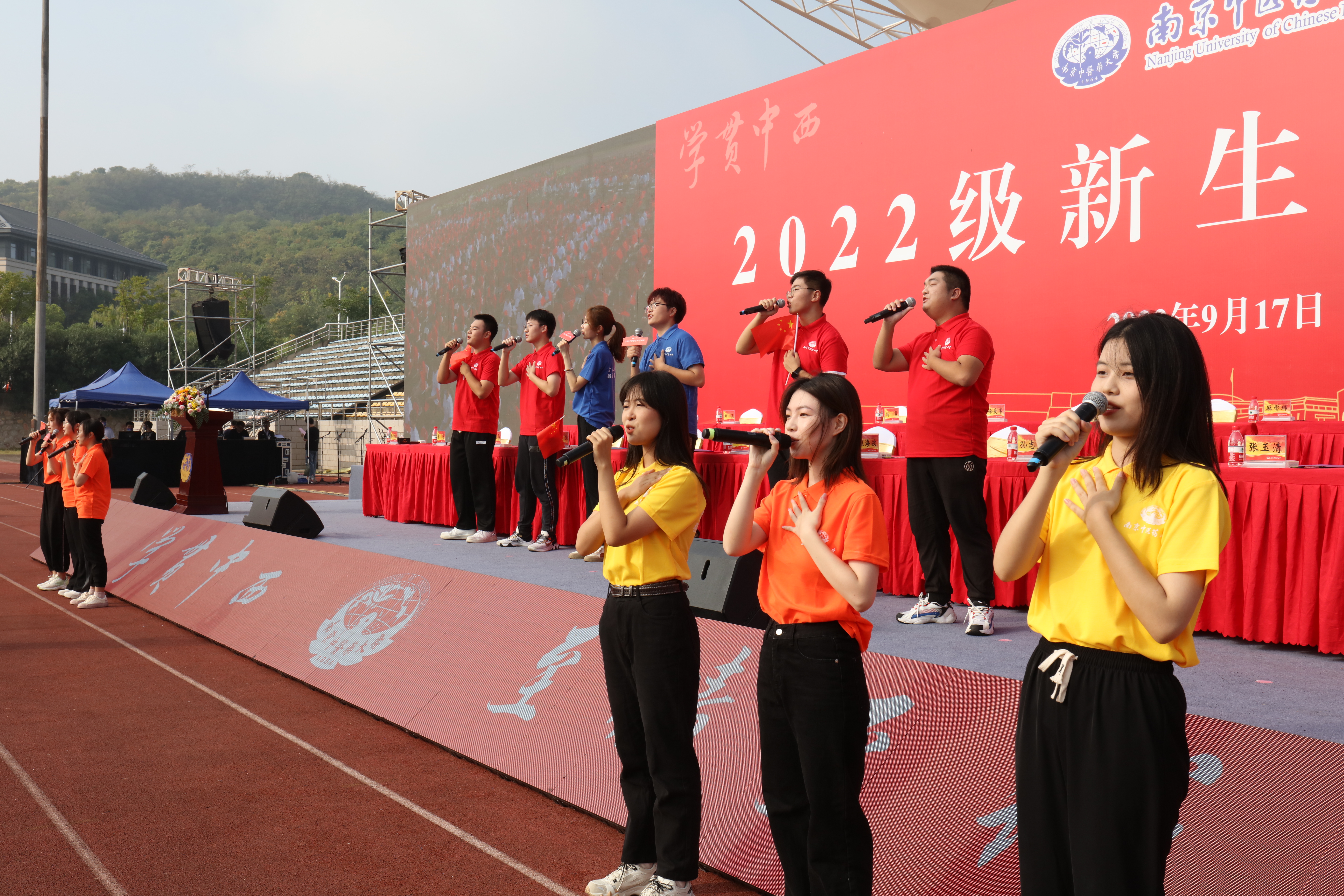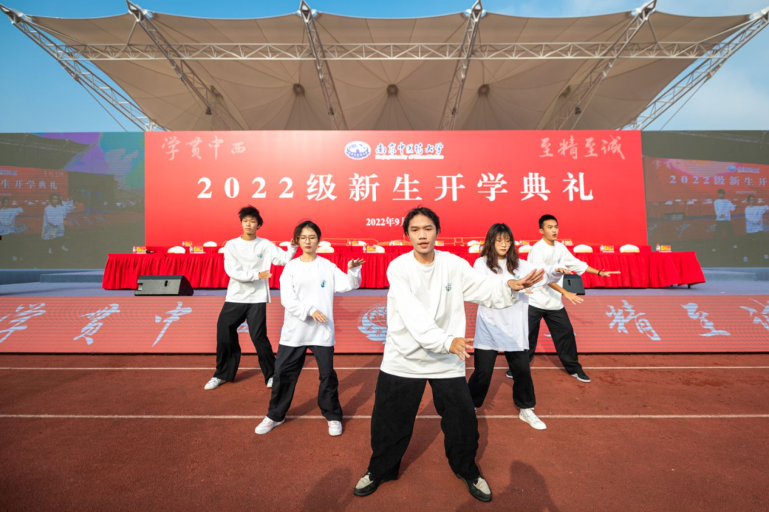 典礼开始前,校大学生艺术团合唱团、街舞社的成员们以歌唱青春、动感街舞等暖场节目点燃全场热情。现场全体新生身着五彩文化衫,在方阵中摆出“NJUCM”字样,以饱满的热情、良好的青春风貌,满怀期待开启崭新“南中医”征程。