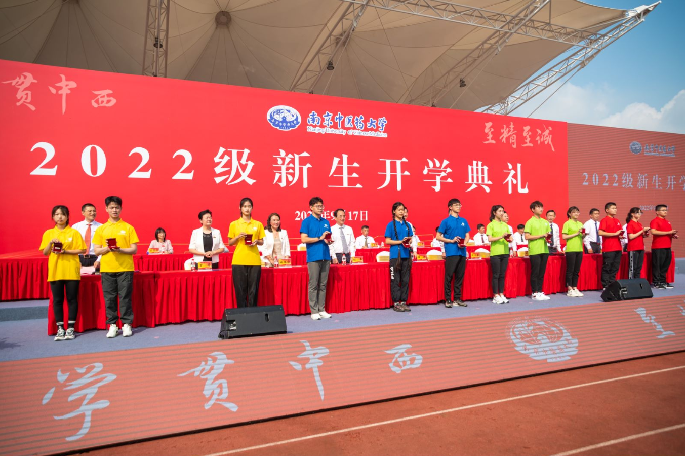 典礼上,校领导为新生代表发放校徽,标志着新生同学们以“南中医人”的身份开启了人生新的篇章。全体新生以青春的名义,向祖国、向党和人民、向中医药事业、向青春梦想庄严宣誓。