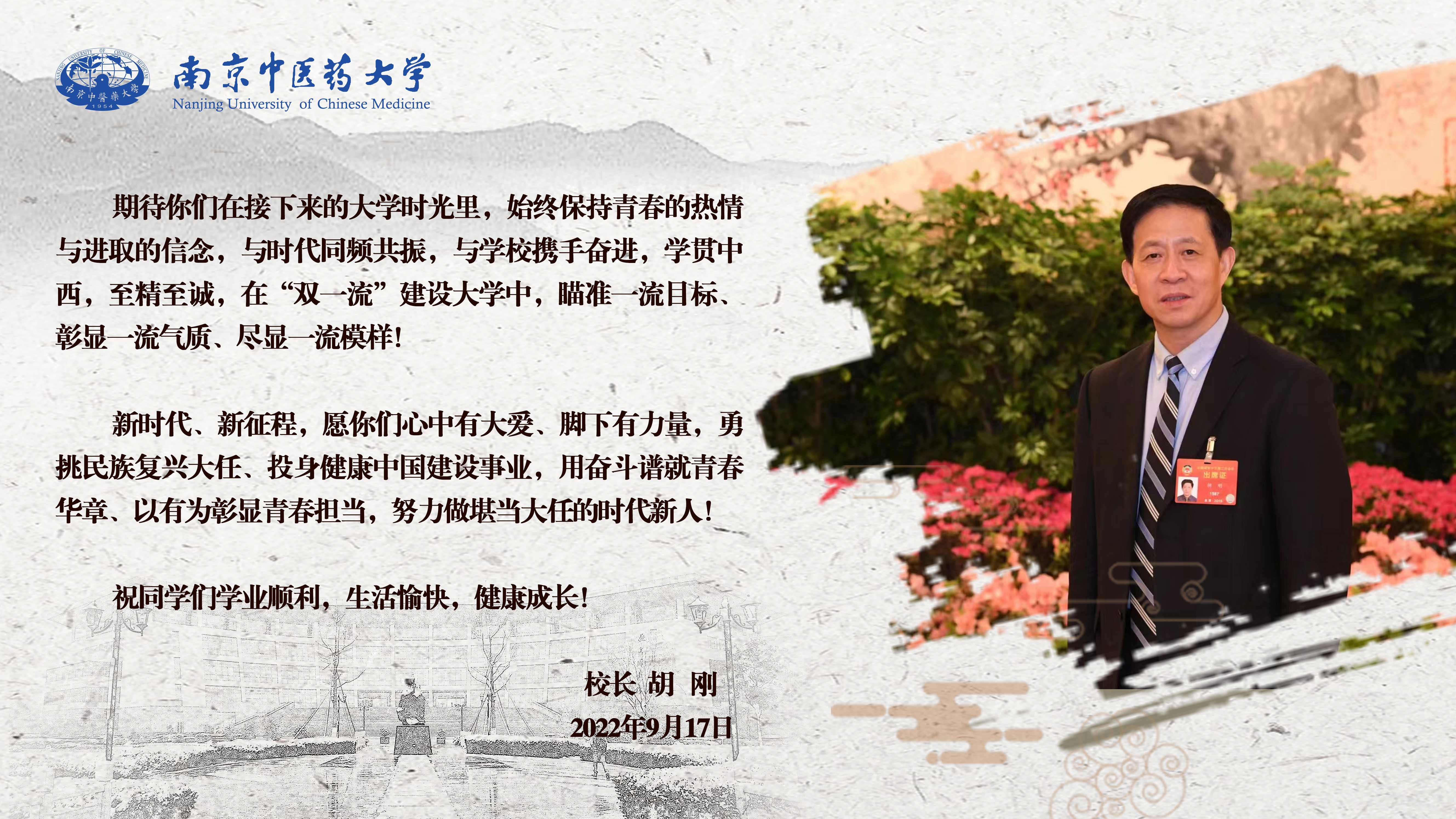 校长胡刚以一封信的形式向2022级全体新生送上亲切的问候和殷切的希望。他希望同学们在南中医“学贯中西,至精至诚”,与时代同频共振,与学校携手奋进。“愿你们心中有大爱、脚下有力量,勇挑民族复兴大任,投身健康中国建设事业,用奋斗谱就青春华章,以有为彰显青春担当,努力做堪当大任的时代新人!”