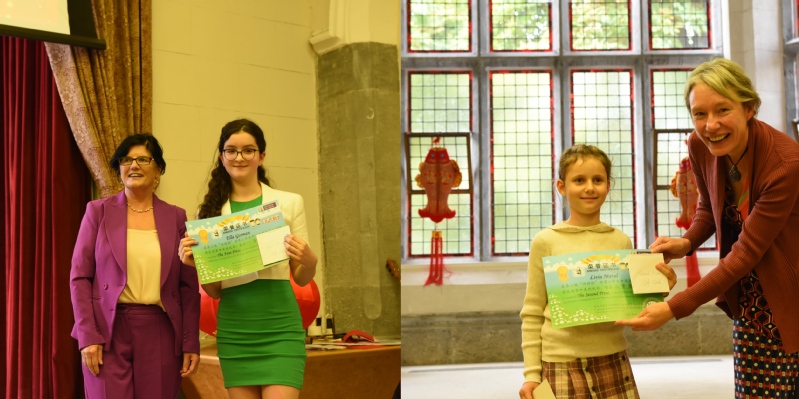 Colette Connolly议员和Becky Whay教授分别为小学生中文比赛获胜选手颁奖