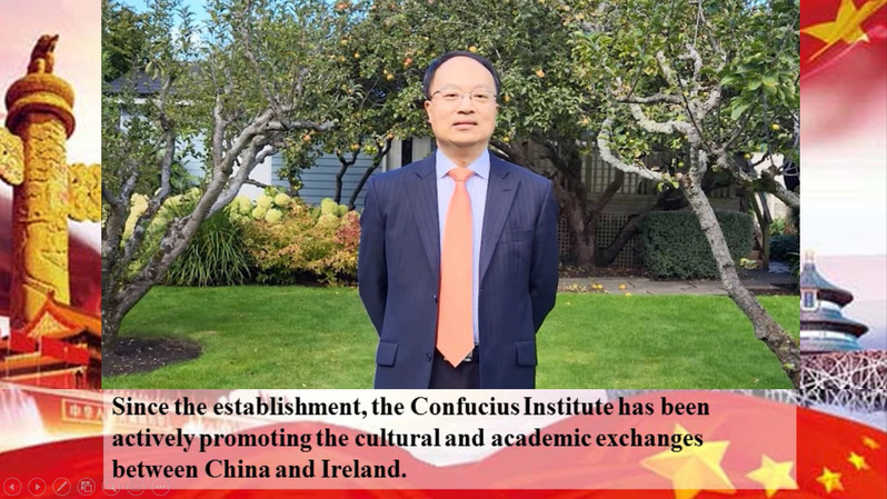 黄河在致辞中充分肯定了高威大学孔子学院成立以来克服疫情带来的困扰,积极作为,在中文、中医教学和促进中爱人文交流方面所做出的贡献,并通过高威大学孔子学院向在爱的孔子学院师生以及广大同胞致以节日的祝福。