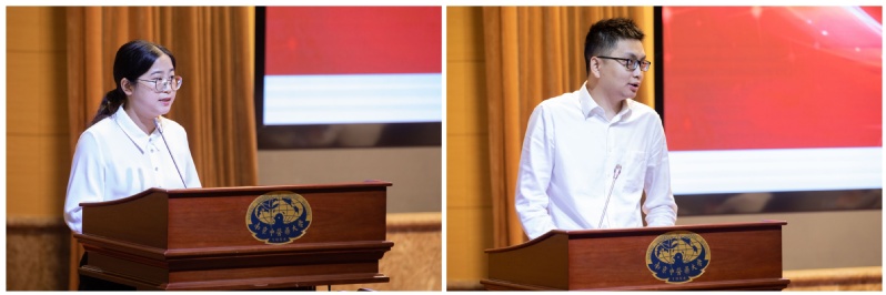 针灸推拿学院•养生康复学院实验针灸学教研室李红晓、人工智能与信息技术学院医学信息工程教研室袁少勋作为2022年新进教师代表发言。李红晓代表新教师们承诺将立德修身、潜心治学、开拓创新;袁少勋从有责任感、业务水平优、关心学生三个方面阐述了对做好教师的理解认识。