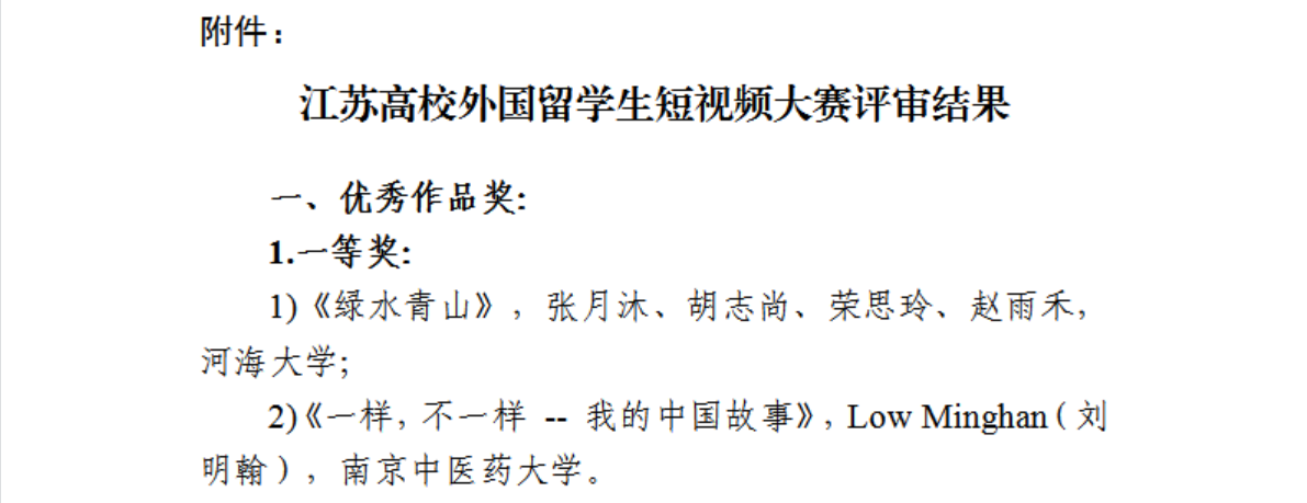 近日,由江苏省高等教育学会外国留学生教育管理研究委员会主办的江苏高校外国留学生短视频大赛获奖名单已公布。我校马来西亚籍博士研究生刘明翰作品《一样,不一样——我的中国故事》荣获一等奖;国际教育学院(港澳台教育中心)教师张瑶获优秀指导教师奖。