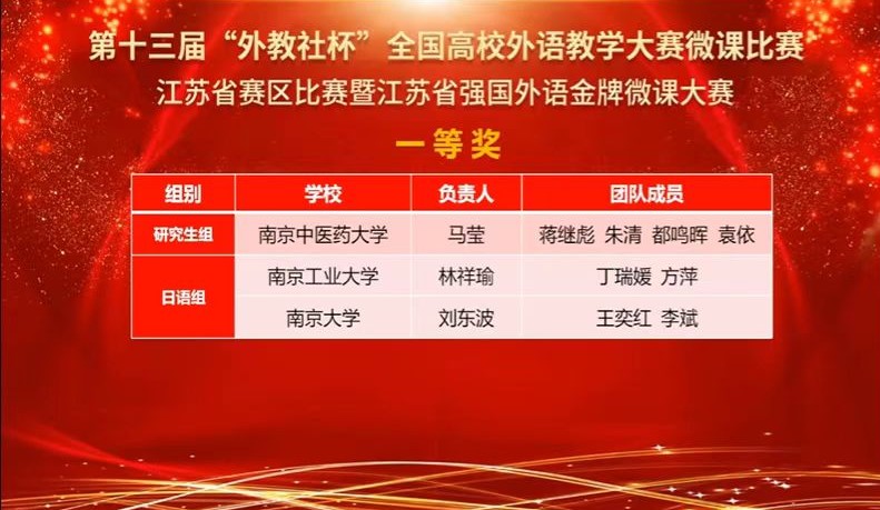 近日,第十三届“外教社杯”全国高校外语教学大赛微课比赛江苏省赛区比赛暨江苏省强国外语金牌微课大赛揭晓获奖名单,由我校公共外语教学部马莹老师领衔的教学团队(马莹、蒋继彪、朱清、都鸣晖、袁依)荣获研究生组一等奖。