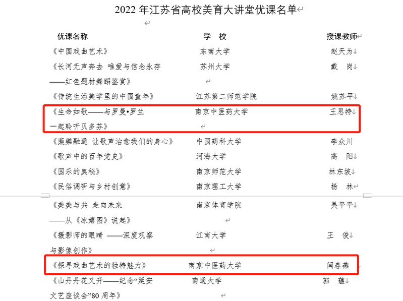 近日,省教育厅公布了2022年江苏省高校美育大讲堂优课评选复评结果,我校马克思主义学院王思特、闫春燕老师申报的美育课程《生命如歌——与罗曼•罗兰一起聆听贝多芬》和《探寻戏曲艺术的独特魅力》双双入选“江苏省高校美育大讲堂优课”。