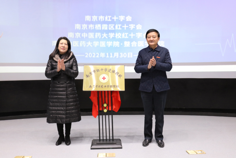 程纯与张敏共同为南京市红十字遗体捐献南京中医药大学接受站揭牌。