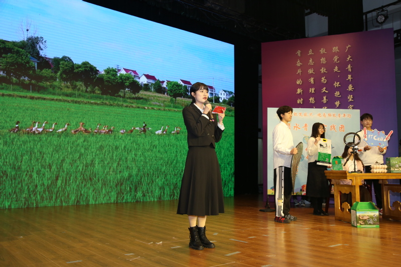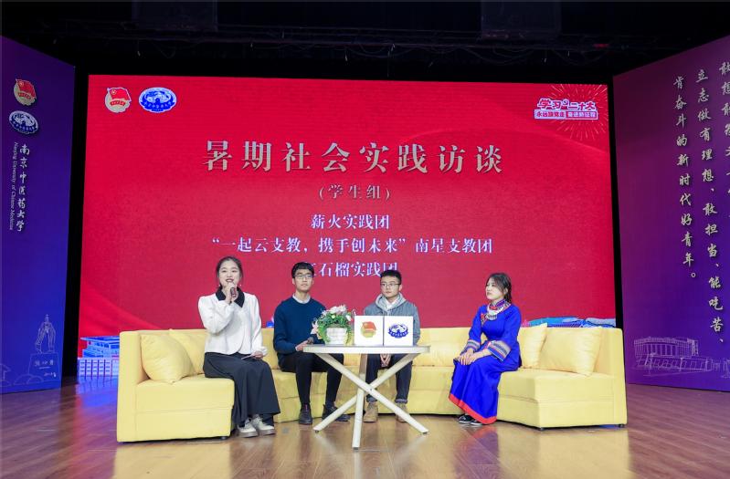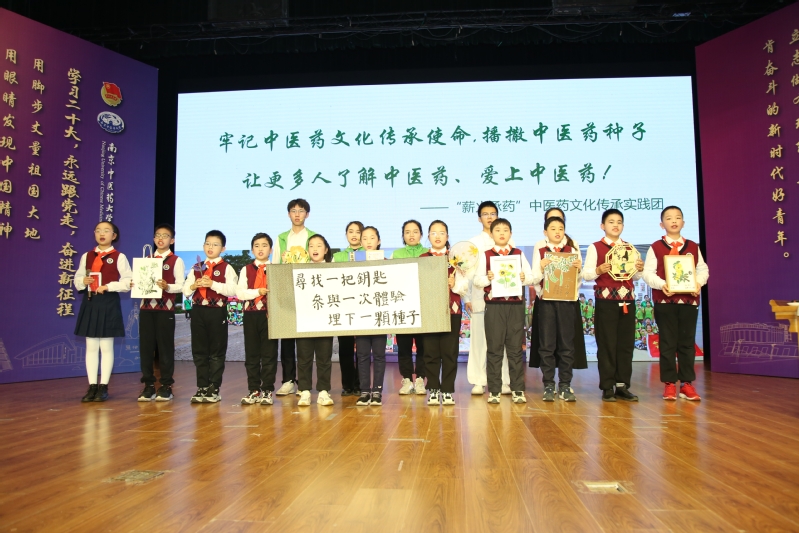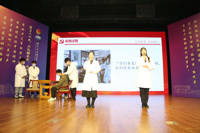 在团队成果展示环节,药学院“岐黄校园行”中医药文化游学项目将金陵小学(广志路分校)的小学生营员请到现场,大手拉小手共同展示了积极传播中医药文化、为中医药发展播种育苗的生动景象。中医学院本草薪火青年志愿实践团将承接“农民健康百村工程”的义诊实践场景搬上舞台,配合讲述,将大医精诚服务百姓的精神再次弘扬。校团支部成长驿站“绿水青山”国情观察实践团的同学重现在南京高淳绿水青山间直播带货的场景,带领师生们深入领略绿色发展理念下现代乡村振兴的美好风光。