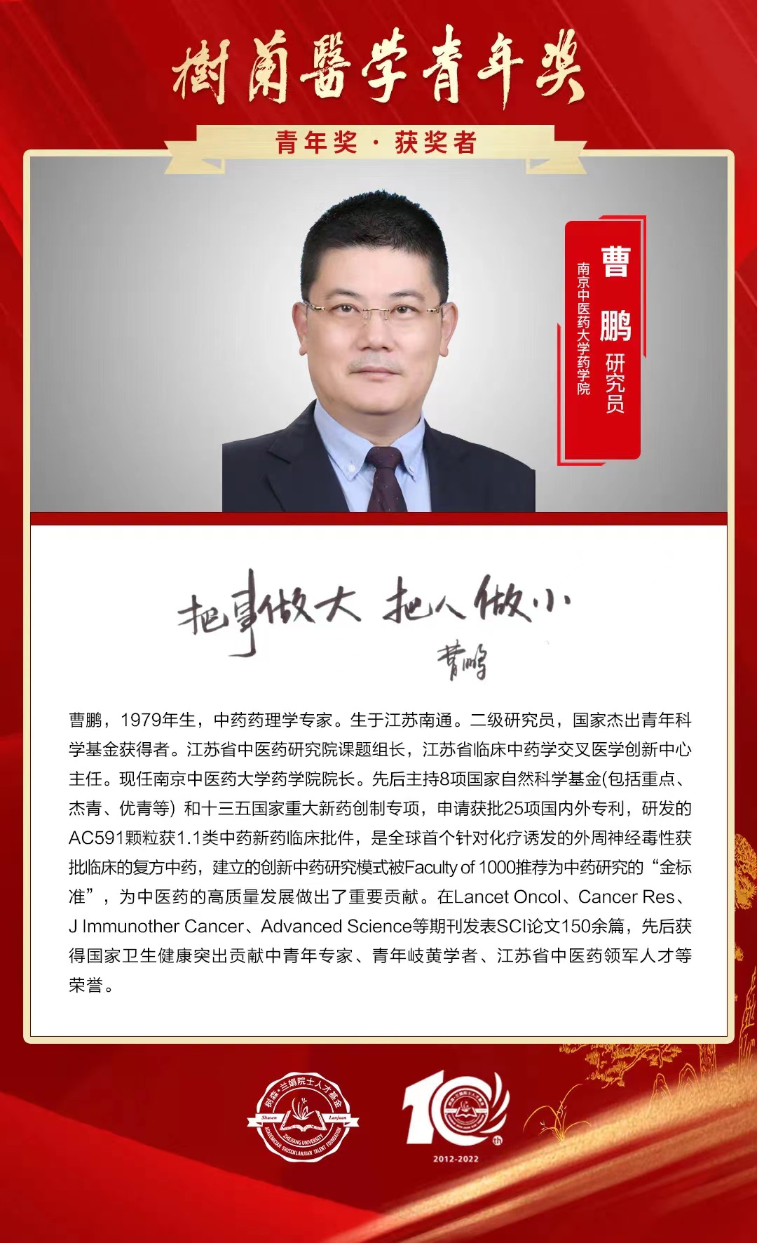 近日,树兰基金成立10周年暨第九届“树兰医学奖”颁奖仪式在浙江省杭州市召开,来自我校药学院的曹鹏研究员获“树兰医学青年奖”。全国人大常委会副委员长陈竺院士、树兰基金理事长郑树森院士和李兰娟院士等出席大会并为获奖者颁奖。