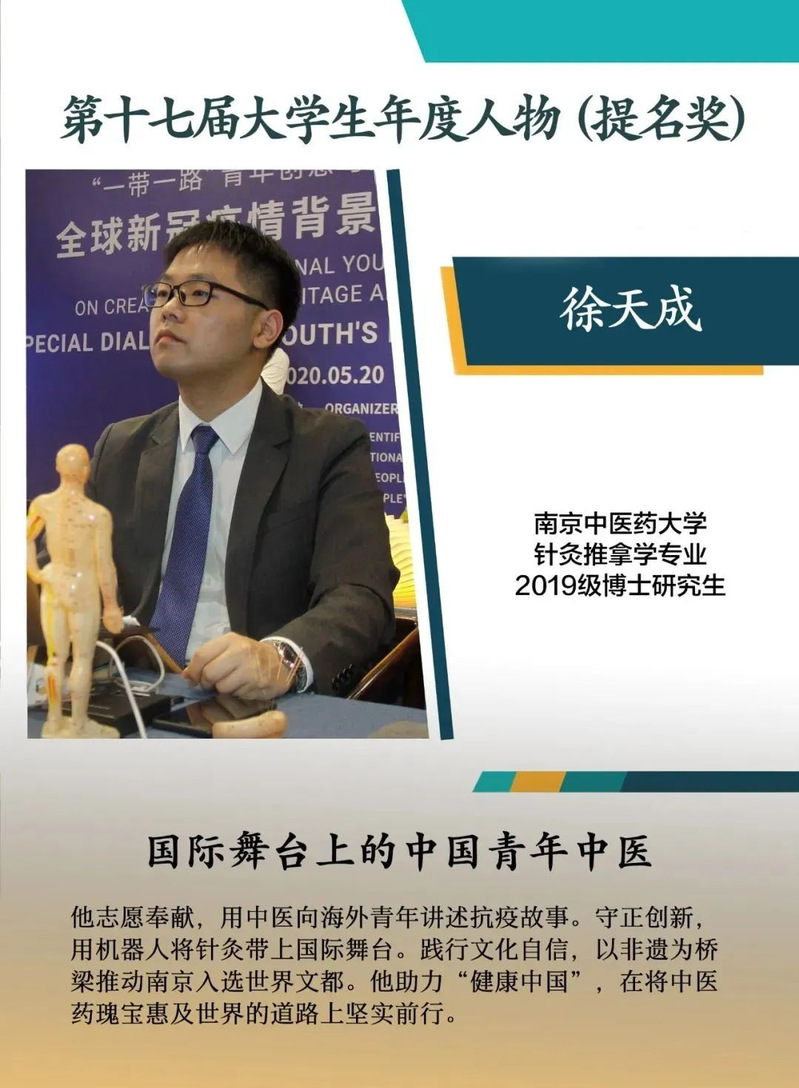 近日,由教育部、人民日报社共同指导,人民网、《光明日报》教育部、《大学生》杂志、中国大学生在线联合主办的第十七届“大学生年度人物”展示活动评选结果揭晓,我校2019级针灸推拿学博士研究生徐天成同学获第十七届“大学生年度人物”提名奖,这也是我校学生在此项评选中的历史最好成绩。