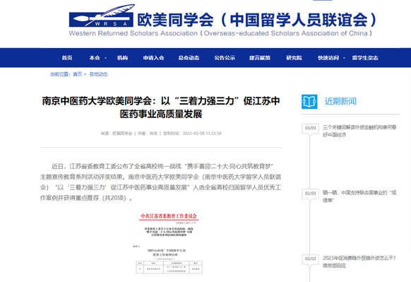 近日,江苏省委教育工委公布了全省高校统一战线“携手喜迎二十大·同心共筑教育梦”主题宣传教育系列活动评奖结果,我校欧美同学会(留学人员联谊会)“以‘三着力强三力’促江苏中医药事业高质量发展”入选全省高校留学归国人员优秀工作案例,并获重点推荐(共20项)。2月8日,全国欧美同学会(中国留学人员联谊会)总会官网刊发专题报道,介绍我校特色工作案例。