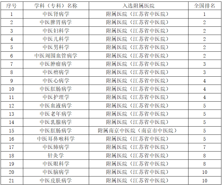 2月19日,中华中医药学会联合中国中医科学院在北京发布《2022年度中医医院学科(专科)学术影响力评价研究报告》(简称“研究报告”),并公布学科(专科)学术影响力榜单。我校共有20个学科进入全国中医医院学科(专科)学术影响力前十位,其中附属医院(江苏省中医院)中医肾病学排名全国第一,附属医院(江苏省中医院)中医脾胃病学、中医妇科学、中医儿科学、中医男科学、中医周围血管病学位列全国第二位,附属医院(江苏省中医院)中医肿瘤病学、中医痹病学位列全国第三位。另外,附属南京中医院(南京市中医院)中医肛肠病学也榜上有名,位列全国第五位。