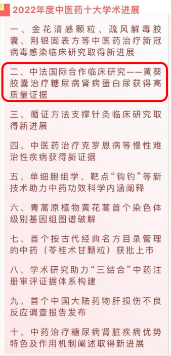 日前,由中华中医药学会主办的2022年度中医药十大学术进展发布会在京召开,我校“中法国际合作临床研究——黄葵胶囊治疗糖尿病肾病蛋白尿获得高质量证据”作为唯一一项国际研究项目入选。