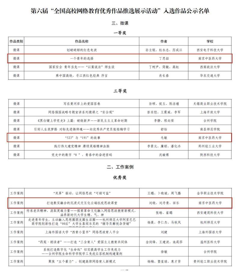 日前,教育部公示了第六届全国高校网络教育优秀作品推选展示活动遴选结果。经学校申报、省教育厅评选推荐、教育部组织专家遴选审议等环节,我校最终获一等奖1项、三等奖1项、优秀奖1项,总成绩位居全省高校第3位、全国高校第21位,取得学校参加此项评选以来的历史最好成绩。其中,我校选送的微课类作品《一个青年的选择》(主讲人:丁思喆)是全省3个获得一等奖表彰的作品之一,也是全省唯一一个微课类一等奖作品。