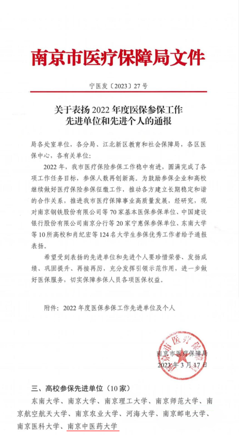 近日,南京市医疗保障局印发《关于表扬2022年度医保参保工作先进单位和先进个人的通报》(宁医发〔2023〕27号),我校作为10所参保工作成绩突出的在宁高校之一获得表彰,荣获“高校参保先进单位”称号。