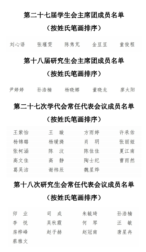 大会以不记名投票的方式选举产生南京中医药大学第二十七届学生会主席团、第十八届研究生会主席团和第二十七次学生代表大会常任代表会议成员、第十八次研究生代表大会常任代表会议成员。