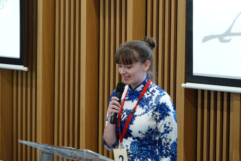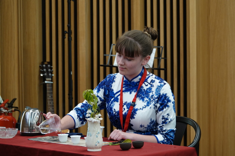 决赛环节,来自6所高校的8名选手,结合大赛“天下一家”主题进行演讲,现场回答评委提问,并进行新的才艺展示。在主题演讲环节,Alyssa从东西方的重要节日展开,表示希望能够在今年跟中国朋友一起到中国体验中国春节,并通过自己的所见所闻向爱尔兰的家人朋友介绍真实的中国。才艺展示环节,伴随着中国古风音乐《一花一世界》,身着青花瓷图案旗袍的Alyssa用她精湛的茶艺为现场嘉宾评委奉上香茶,赢得了全场赞赏。最终,Alyssa获得本次比赛的最佳潜力奖。
