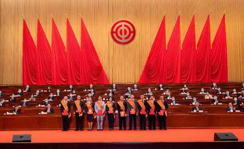 刘军楼(右四)作为获奖代表在省工会第十五次代表大会闭幕式上接受表彰