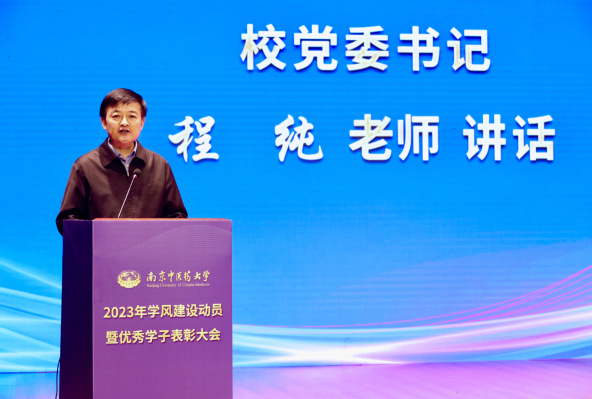 程纯代表学校向受表彰的先进集体和先进个人表示祝贺,并带领大家回顾了不平凡的2022年全校师生凝心聚力取得的成绩。他指出,学风建设是全面落实立德树人根本任务的必然要求。我校历来重视学风建设,学校党政高度关注、常抓不懈。对照一流学风建设标准,对照南中医追求卓越的精神,对照教育部本科教育教学审核评估要求,程纯对我校下一步学风建设提出三点意见,一是提高站位,凝聚共识,充分认识学风建设的重大意义。学风是学校的治学之本、立校之本、发展之本,学风建设对于落实立德树人根本任务、建设中国特色世界一流大学具有重要意义。学风问题关乎学生、关乎教师、关乎学校管理,更关乎培养德智体美劳全面发展的社会主义建设者和接班人的大学使命。二是全员参与,多方协同,大力营造学风建设的浓厚氛围。一流的大学一定要有一流的学风,建设一流学风是加快“双一流”建设、实现内涵式发展的基本要求和重要内容。全校师生要齐心协力做好学风建设工作,不折不扣落实各项部署和要求,把加强学风建设与坚守为党育人、为国育才的初心使命,与学习贯彻党的二十大精神结合起来,以更优良的学风、更扎实的工作,书写迈向世界一流中医药大学的时代篇章。三是务实求真,勤奋刻苦,扎实推进学风建设。程纯指出,此次会议既是对过去一年学风建设成果的梳理总结,也是向即将到来的本科教育教学审核评估发出的动员令,更是为一流学风建设再出发吹响的集结号。希望全校师生齐心协力做好学风建设工作,希望广大同学发挥主人翁精神,爱校荣校,不负韶华,努力奋斗,以永不服输的心态、勇攀高峰的精神争创一流争创佳绩。