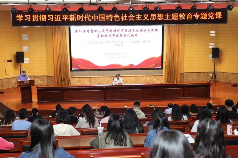 根据主题教育工作部署,5月18日下午,校党委副书记程革在仙林校区丰盛楼报告厅以《深入学习贯彻习近平新时代中国特色社会主义思想,勇担振兴中医药的时代使命》为题讲授主题教育专题党课。党委组织部、党委宣传部、离退休处、马克思主义学院·医学人文学院、卫生经济管理学院两百余名师生党员参加学习,省委第十六巡回指导组郝峰、刘翊到场指导。专题党课由卫生经济管理学院党委书记姚峥嵘主持。