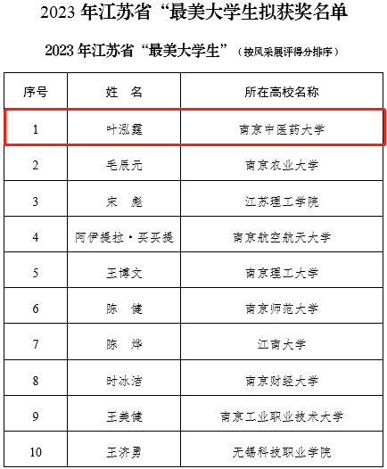 根据《关于组织开展第十三届“江苏省大学生年度人物和高校辅导员年度人物”暨2023年“最美大学生”“最美高校辅导员”推选展示工作的通知》(苏教社政函〔2023〕2号)要求,经学校推荐、材料审核、专家初评、公示复核和风采展评,遴选出2023年江苏省“最美大学生”拟获奖人选10人。5月20日在南京农业大学举办的风采展评中,39位优秀的大学生展开激烈角逐,我校针灸推拿学院·养生康复学院2020级本科生叶泓霆同学风采展评得分94.06,位列第1,入围2023年江苏省“最美大学生”。