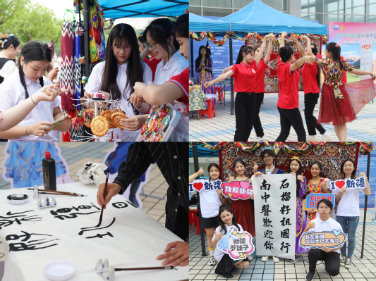 中午的大学生活动中心北广场,浓浓民族风情的巴扎集市热闹非凡。实践团师生化身新疆文化“代言人”,在热情洋溢的新疆歌舞表演中开展新疆文创产品展示、民族特色服饰换装、新疆干果品尝等活动,展示出新疆经济社会发展成就和民族团结和谐、旅游风光宜人的良好形象,让南中医师生领略神秘西域、大美新疆。我校大学生社团在活动现场作书法、汉服等传统文化展演,两校民族乐团学生现场即兴共奏《青春舞曲》,载歌载舞,青春洋溢。我校师生被实践团的热情所感染,纷纷加入换装、歌舞行列,手挽手、肩并肩,像石榴籽一样紧紧抱在一起。