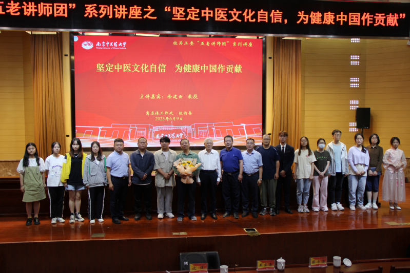 6月9日下午,我校关工委、关爱协会联合校团委在仙林校区丰盛楼报告厅举行“五老讲师团”系列讲座之“坚定中医文化自信,为健康中国做贡献”主题讲座。本次讲座邀请中医学院医史各家学说教研室主任、硕士生导师徐建云教授为主讲嘉宾。校关工委常务副主任王家法、校关工委秘书长沈强、校团委书记陈小进出席活动。300余名学生参加活动。