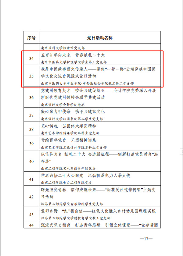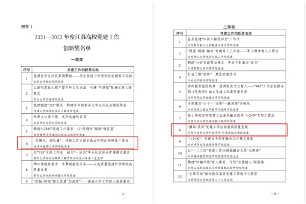 我校药学院党委《“四强化、四构建”将教工党支部打造成学院的坚强战斗堡垒》荣获江苏高校党建工作创新奖一等奖,中医学院·中西医结合学院党委《“解码·浸润”党建工作法助推高质量发展》荣获江苏高校党建工作创新奖二等奖;护理学院学生第三党支部《五育并举向未来青春献礼二十大》、中医学院·中西医结合学院教工第二党支部《我是中医故事薪火传承人——带你“一带一路”云端穿越中国医学文化交流史沉浸式党日活动》荣获江苏高校最佳党日活动优胜奖。