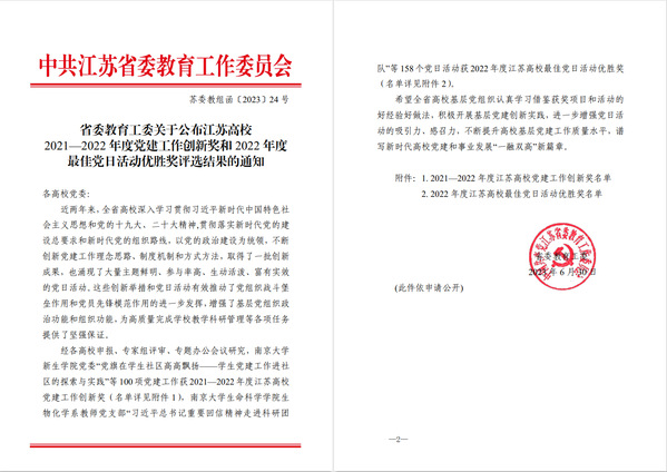 近日,江苏省委教育工委公布了江苏高校2021—2022 年度党建工作创新奖和2022年度最佳党日活动优胜奖评选结果,共评选出党建工作创新奖一等奖11项、二等奖29项、三等奖60项,“最佳党日活动”优胜奖158个。其中,我校获党建工作创新奖一等奖、二等奖各一项,“最佳党日活动”优胜奖2个。
