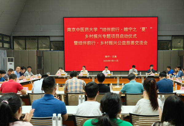 7月11日,南京中医药大学“结伴前行·睢宁之‘夏’”乡村振兴专题项目启动仪式暨“结伴前行·乡村振兴公益慈善交流会”在睢宁县王集镇顺利举办,此次活动也是南京中医药大学围绕对口帮促地睢宁县开展的乡村振兴主题创新创业系列项目之一,旨在助力乡村振兴事业的同时,持续衔接资源赋能学校优秀学子“结伴前行赴农桑”。
