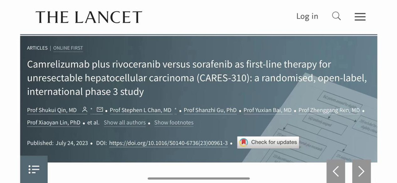 7月24日,南京中医药大学秦叔逵教授团队领衔完成的最新研究成果“Camrelizumab plus rivoceranib versus sorafenib as first-line therapy for unresectable hepatocellular carcinoma (CARES-310): a randomised, open-label, international phase 3 study”在线发表于国际医学顶尖杂志THE LANCET (《柳叶刀》),秦叔逵教授为文章的第一作者兼通讯作者,南京中医药大学金陵医院为第一单位。这是《柳叶刀》创刊200年来,肿瘤学领域中国学者主导的国际性III期临床研究论文首次登上《柳叶刀》主刊,这是我校新一轮“双一流”建设的重大科研突破。