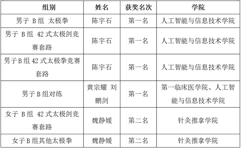 此次我校共选派12名运动员参赛,经过3天紧张激烈的角逐,我校运动员勇创佳绩,共获得金牌四枚、银牌二枚,第六名二项、第七名三项、 第八名一项。比赛期间,校党委常委、副校长胡立宏作为代表团团长到会指导,总教练樊静,教练员张凯、黄秀带队参赛。