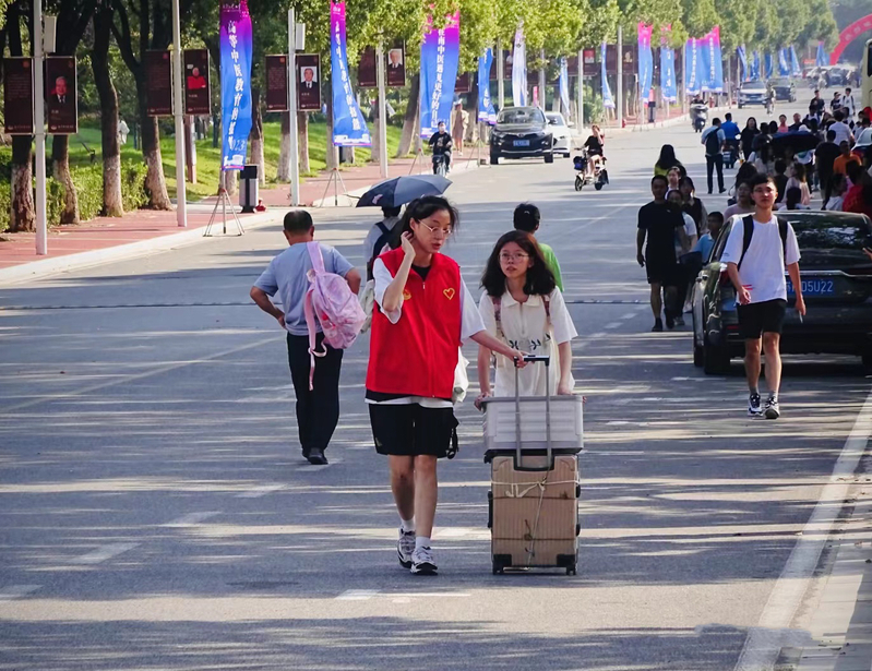 清晨,迎新工作有序展开。校园中到处彩旗飘扬,装饰一新,洋溢着欢迎新同学的热烈氛围。7点钟,师生志愿者在南京站、南京小红山客运站、南京南站、南京南客运站等地等待陆续到来的新生和家长。进入仙林校区,从地铁站到校门口、从宿舍楼到报到区,活跃在各个点位的1000余名学生志愿者们组成了亮眼的“志愿红”,为“萌新”们搬运行李、引导答疑,宿管阿姨们则在各宿管站入口办理新生入住手续。师生员工通力协作,用暖心贴心的志愿服务连接起了从校门到宿舍门的“最后一公里”。