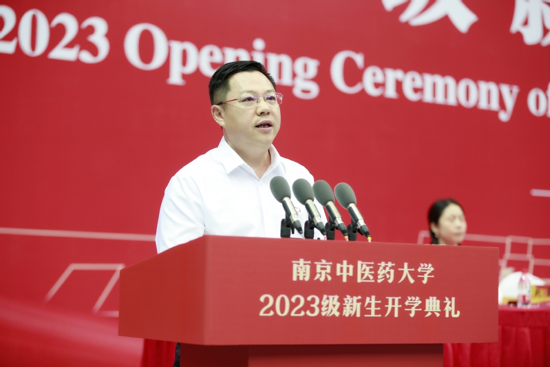 9月6日上午,南京中医药大学2023级新生开学典礼在仙林校区体育馆举行。校党委书记乔学斌,校长程海波,校领导程革、方祝元、徐树法、吴文忠、胡孔法、嵇红梅、孙秀兰、曹鹏、赵霞、郝达富出席典礼;校学生工作领导小组成员,各学院党政负责人,教师代表,新生辅导员,学业指导教师,5740名本科生、研究生、留学生新生参加典礼。典礼通过线上平台同步直播,学校师生、校友、家长共两万余人观看了网络直播。典礼由副校长徐树法主持。