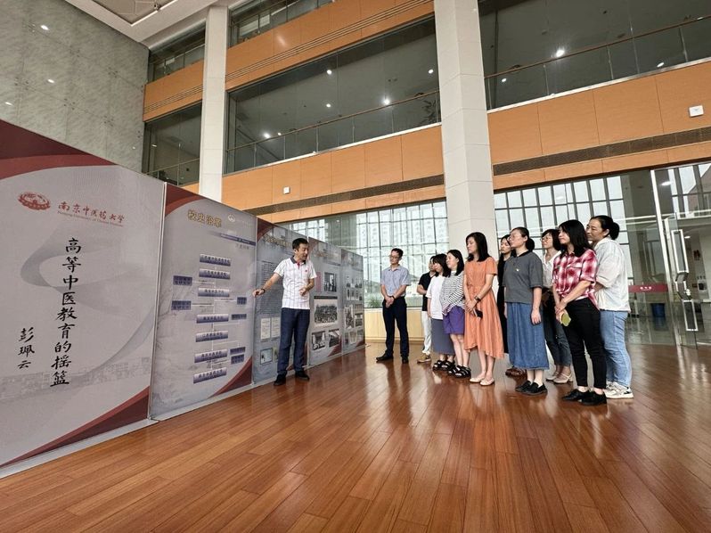 全体同志一起来到图书馆参观校史展。学院纪委书记李鑫向大家介绍了南京中医药大学的办学发展历程。看着一张张照片,一本本文献档案,回顾过去69年来一代又一代南中医人筚路蓝缕、以启山林、接续奋斗、勇攀高峰的拼搏历程,从汉中门校区、仙林校区到泰州校区“一校三区”办学格局的形成,大家真切地感受到学校在学科建设、教育教学、科学研究、人才培养等方面取得的辉煌成就。