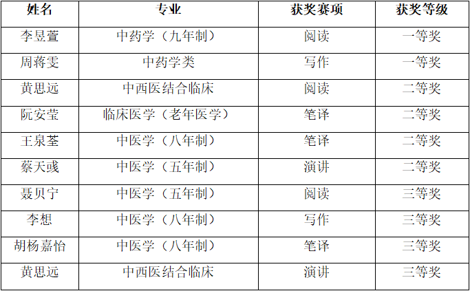 本次大赛设阅读、写作、演讲、笔译、口译等分赛项比赛。我校选拔出来自中医学院•中西医结合学院、第一临床医学院、药学院、医学院、养老服务与管理学院的14名同学参加比赛。经过激烈角逐,我校选手获阅读比赛一等奖1项、二等奖1项、三等奖1项;写作比赛一等奖1项、三等奖1项;笔译比赛二等奖2项、三等奖1项;演讲比赛二等奖1项、三等奖1项,实现该项赛事省级一等奖的突破,并首次入围全国决赛,取得参赛以来历史最好成绩。