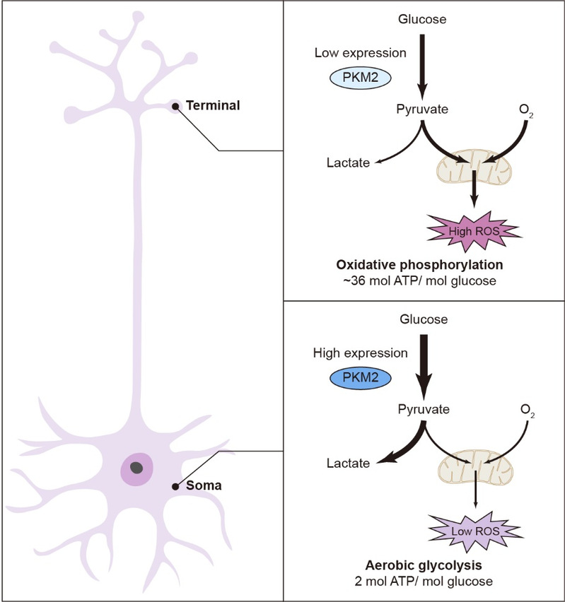 胡刚教授团队发现,神经元在胞体处主要采用有氧糖酵解,而在神经末梢处主要采用氧化磷酸化代谢。这种策略使得神经末梢能够高效地产生能量,支持神经递质释放与回收等高能耗功能。同时,神经末梢通过突触可塑性可以克服氧化磷酸化产生的活性氧带来的结构损伤。另一方面,胞体是神经元储存遗传物质与合成蛋白质的地方,因此对活性氧的防护尤为关键。不产生活性氧的有氧糖酵解对于胞体而言是一条更安全的糖代谢途径(图一)。这些研究发现提示,神经元以一种智慧的方式,在不同亚细胞结构处采用不同的糖代谢方式,既满足了能量需求,又避免了氧化损伤。研究丰富了神经元耗能代谢方式的理论,为相关神经精神疾病的干预策略及其治疗药物研发提供了新的研究思路。