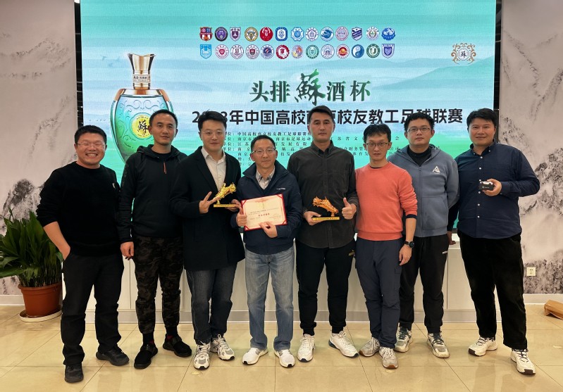 近日,2023年中国高校南京校友教工足球联赛闭幕式在南京大学鼓楼校区举行,我校教工足球队积极参与、紧密配合,最终以6胜2平的战绩赢得本次比赛甲级B组亚军,并荣获本届赛事“最佳拼搏奖”,队员戚端、哈斯特尔·加尔肯分别荣获赛事最佳射手“金靴奖”和“铜靴奖”。