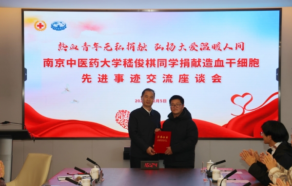 12月5日下午,学校召开嵇俊棋捐献造血干细胞先进事迹交流座谈会。校党委常委、副校长徐树法向嵇俊棋同学颁发了南京中医药大学红十字会“优秀会员”荣誉证书和慰问金。徐树法在讲话中表达了对嵇俊棋同学捐献义举的高度褒扬和亲切慰问,表示嵇俊棋同学的捐献行为,是给患者带来重生希望的大爱,是对“健康所系、性命相托”医学生誓言最深刻的践行。