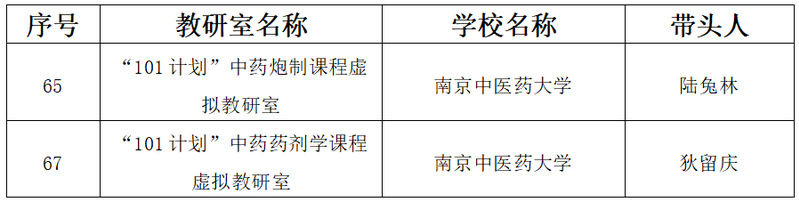近日,教育部办公厅公布第三批虚拟教研室建设试点名单(教高厅函〔2023〕22号)。药学院狄留庆教授为带头人的中药药剂学课程虚拟教研室、陆兔林教授为带头人的中药炮制课程虚拟教研室入选。