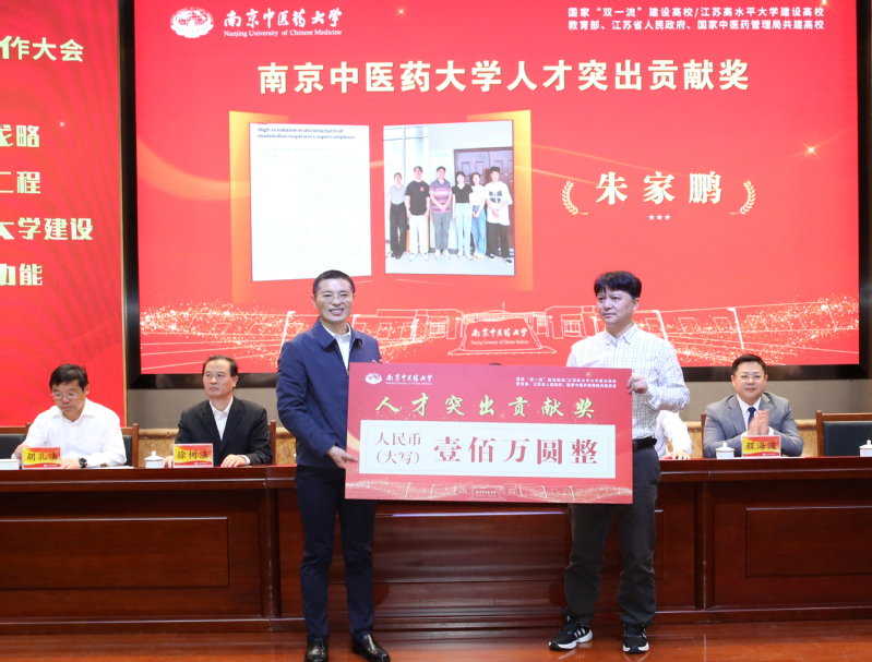 乔学斌书记为人才突出贡献奖获得者朱家鹏教授颁奖