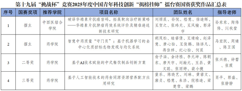 本次成绩取得,不仅是对我校参赛师生辛勤付出与卓越能力的高度肯定,更是我校持续深化创新创业教育改革、着力提升学生实践创新能力的集中体现。校团委将以此为契机,联动教务处、学工处和研工部等部门,进一步营造崇尚科学、勇于创新的校园氛围,扎实推进大学生科创项目落地转化的“后半篇文章”,鼓励更多青年学子投身科技强国伟业,在建设中国特色、中国风格、中国气派一流中医药大学的新征程中贡献更多青春力量。