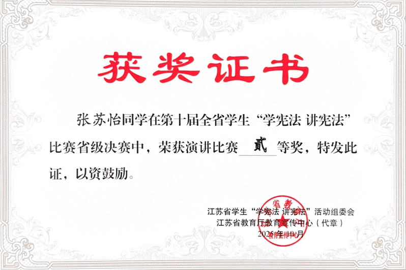 10月18日至19日,由江苏省教育厅主办的第十届江苏省大学生“学宪法 讲宪法”演讲比赛在南京举行。针灸推拿学院·养生康复学院张苏怡同学经过校赛选拔推荐、省级初赛,从全省百余位参赛者中脱颖而出,进入省级决赛,并最终荣获江苏省决赛二等奖。