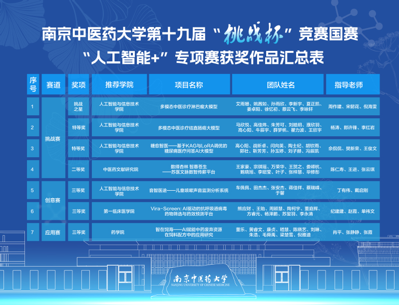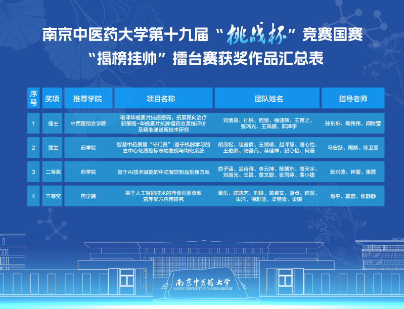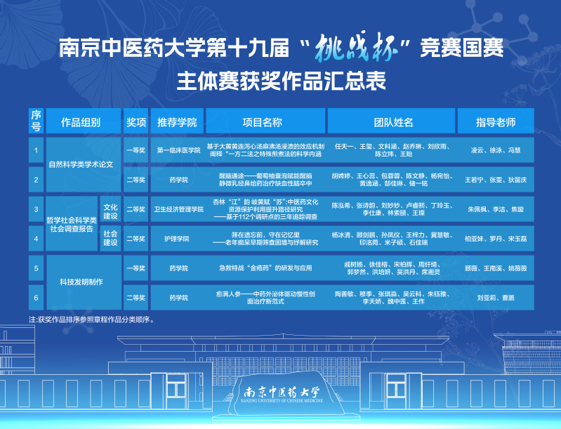 校团委通过“揭榜挂帅”“标志性成果滚动激励”等项目培育机制,压实“院系初赛—校内复赛—省级决赛—国赛终评”选拔培优责任,多渠道广泛宣传赛事,深入进行专项工作对接,扎实推进大学生科创项目落地转化的“后半篇文章”。全体参赛团队聚焦主干学科优势特色,开展“中医药+”科研攻关,历经一年多的调研打磨、模拟答辩与成果优化,在全国决赛终评舞台上以精准的项目展示、流畅的答辩阐述和扎实的科研学术功底,充分展现了我校青年学子“敢闯敢创”的精神风貌,彰显了我校在中医药拔尖创新人才培育和学生创新创业教育能力建设方面的深厚积累与卓越实力。