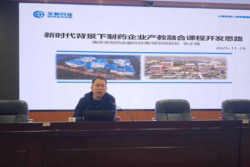 张小猛以《新时代背景下制药企业产教融合课程开发思路》为题,系统分析了当前制药企业面临的机遇与挑战,结合圣和药业第三代EGFR抑制剂研发的实践案例,分享了企业在创新药物研发及产教融合课程开发、人才协同培养方面的经验。