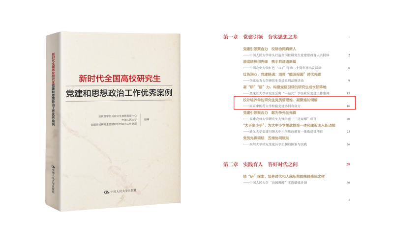 近日,新时代全国高校研究生党建和思想政治工作研讨会(2025)在中国人民大学举行。会上发布了由教育部学位与研究生教育发展中心指导,中国人民大学、全国高校研究生党建和思想政治工作联盟组编的《新时代全国高校研究生党建和思想政治工作优秀案例》。我校案例《校外培养单位研究生党员管理难、凝聚难如何解——南京中医药大学校院党建协同有良方》入选。