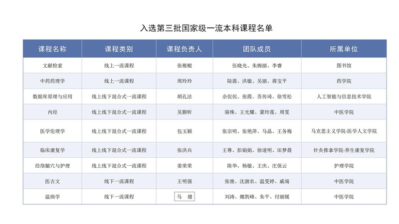 近日,教育部公布第三批国家级一流本科课程认定结果,我校9门课程入选。至此,我校国家级一流本科课程总数已增至29门,在全国中医药院校中居第二位,实现国家级一流课程本科专业全覆盖,专业与课程协同提升的高质量发展体系得到进一步完善。