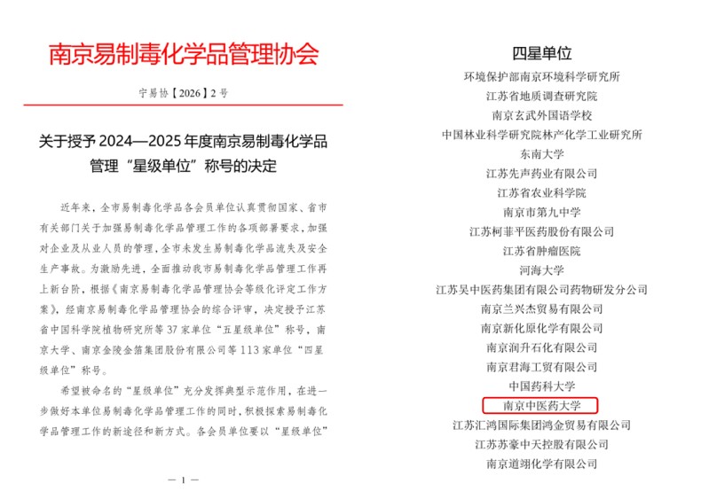 近日,南京易制毒化学品管理协会公布了《关于授予2024-2025年度南京易制毒化学品管理“星级单位”称号的决定》,我校被授予“2025年度南京市易制毒化学品行业四星级单位”称号,这也是我校首次在该行业领域取得荣誉。