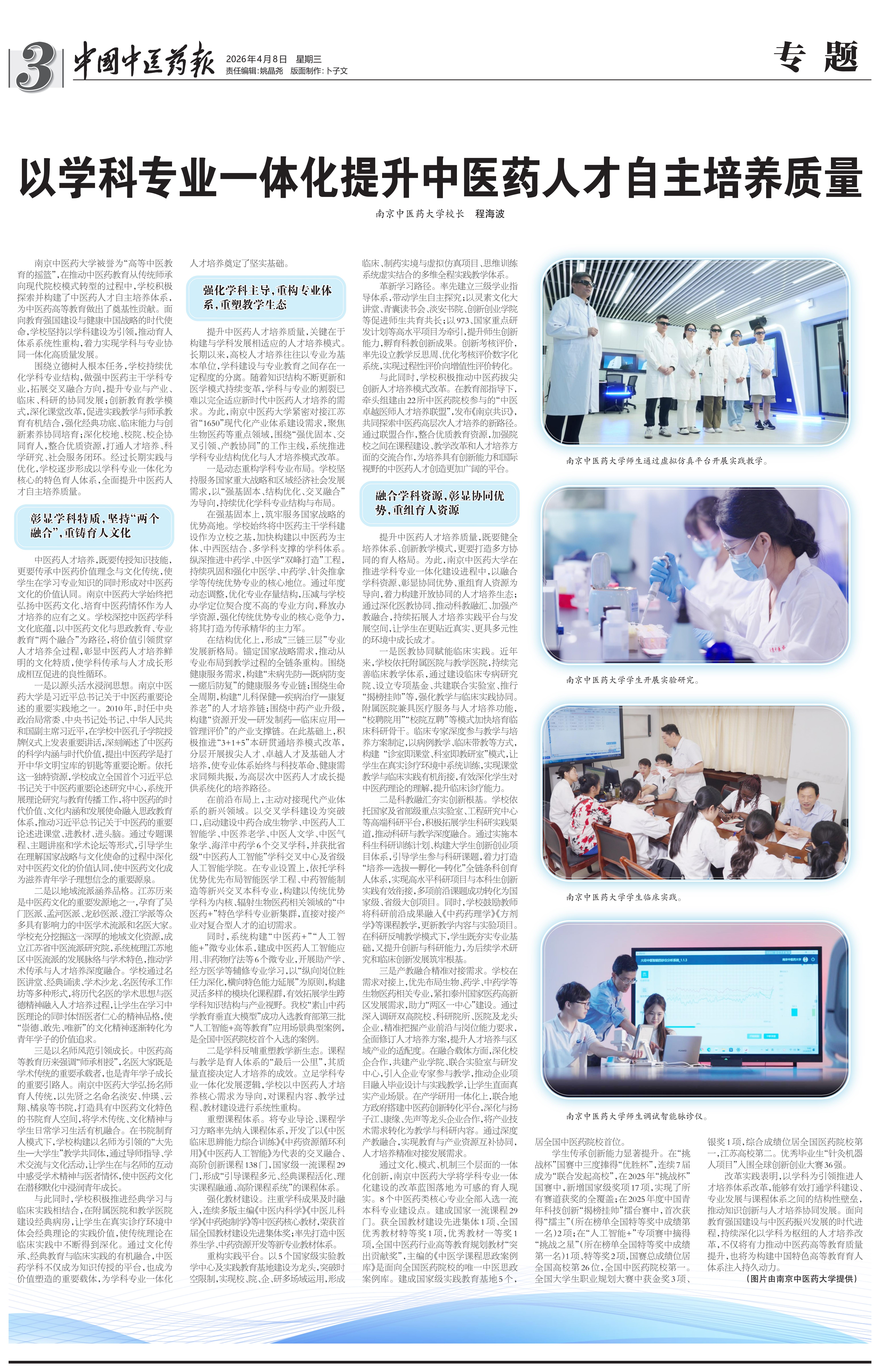 2026年4月8日,《中国中医药报》整版刊发程海波校长署名文章《以学科专业一体化提升中医药人才自主培养质量》。全文内容如下。